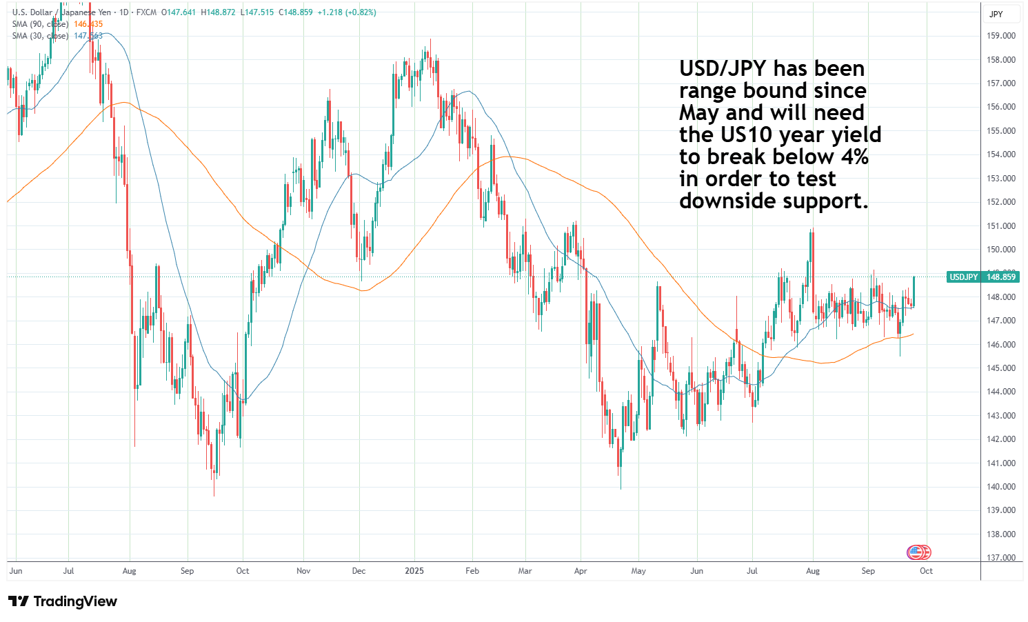 Inflation has risen modestly so the Bank of Japan voted 7-2 to keep rates steady. Japan would like to see the yen stronger overall, but it is content with the U.S. cutting rates to achieve this and protecting a USD/JPY exchange rate above 160. Japan has seen moderate growth but still suffers from long-term structural issues, such as an aging population and low birth rates. Japan, unlike the other G7 countries, have not imported immigrants globally to supplement a cheap labor base. Since Trump initiated tariffs globally, USD/JPY has been contained between the 140-150 range. With more Fed cuts coming this year, the downside may be more vulnerable, especially as bond yields trend lower.