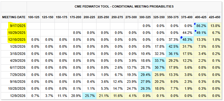 Though Powell did announce a definite cut, the language used in addressing “the balance of risks is shifting away from inflation and toward employment” and “softening labor markets could justify a rate cut” were all the hints that the market needed to send the S&P 500 above 1% and short-term rates down 4 basis points (BPS) (-.04%) in one day; this was equal to a 1% loss in the three-month T-Bill rate. For context, the three-month T-Bill rate is at the same level as it was in November 2022. Rewinding the clock to November 2022, the Fed continued to raise rate an additional 1.5% before pausing in July 2023. Below is the Fed Watch Tool showing the probability of interest rate cuts for September, October and December 2025.